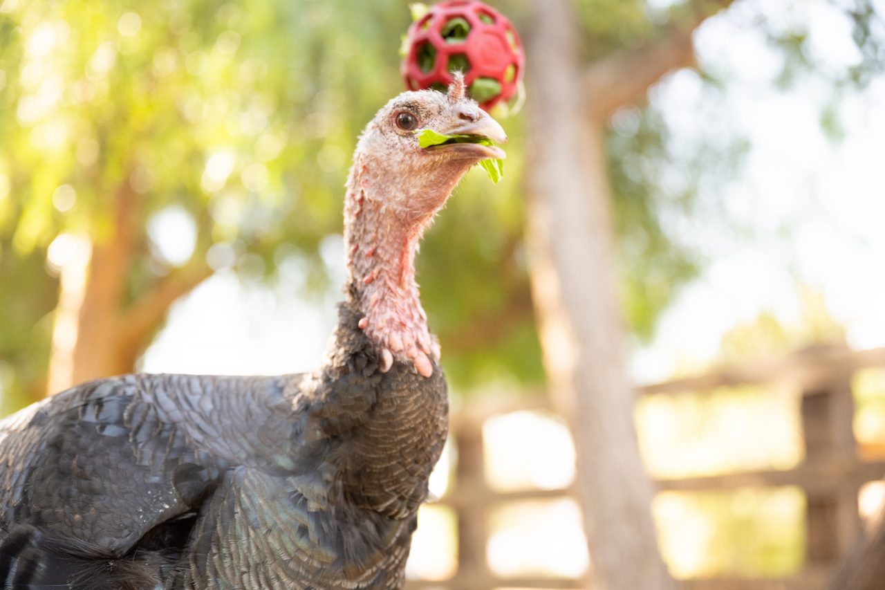 Rescued turkey Thelma eats lettuce from a hanging enrichment ball at Farm Sanctuary Adopt Now